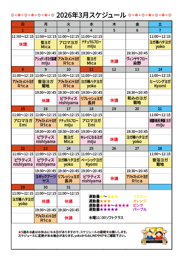 tel.090-4024-1129 体験レッスン お問い合わせ ホーム コンセプト スケジュール 新着情報・コラム レッスンメニュー インストラクター 料金・コース よくある質問 アクセス 体験レッスン お問い合わせ スケジュールschedule ホーム 新着情報 お知らせ yokoヨガスタジオ2026年3月のスケジュール 2026.02.14 yokoヨガスタジオ2026年3月のスケジュール 3月のスケジュールを更新しました。 スケジュールに変更がある場合があります。yokoからのLINEやHPをご確認下さい。 一覧 次へ »